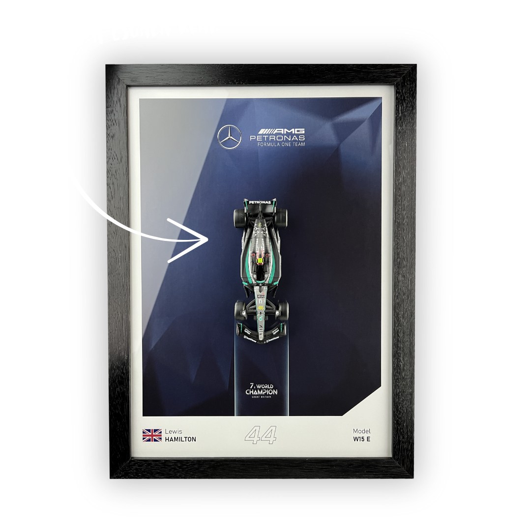 Reviví la pasión de la Fórmula 1 con este increíble cuadro coleccionable del 7 veces campeón del mundo Lewis Hamilton. Diseñado para verdaderos fanáticos del automovilismo, este exclusivo cuadro con un modelo a escala 1:43 integrado, captura la esencia de la velocidad y la emoción del piloto británico y Mercedes.