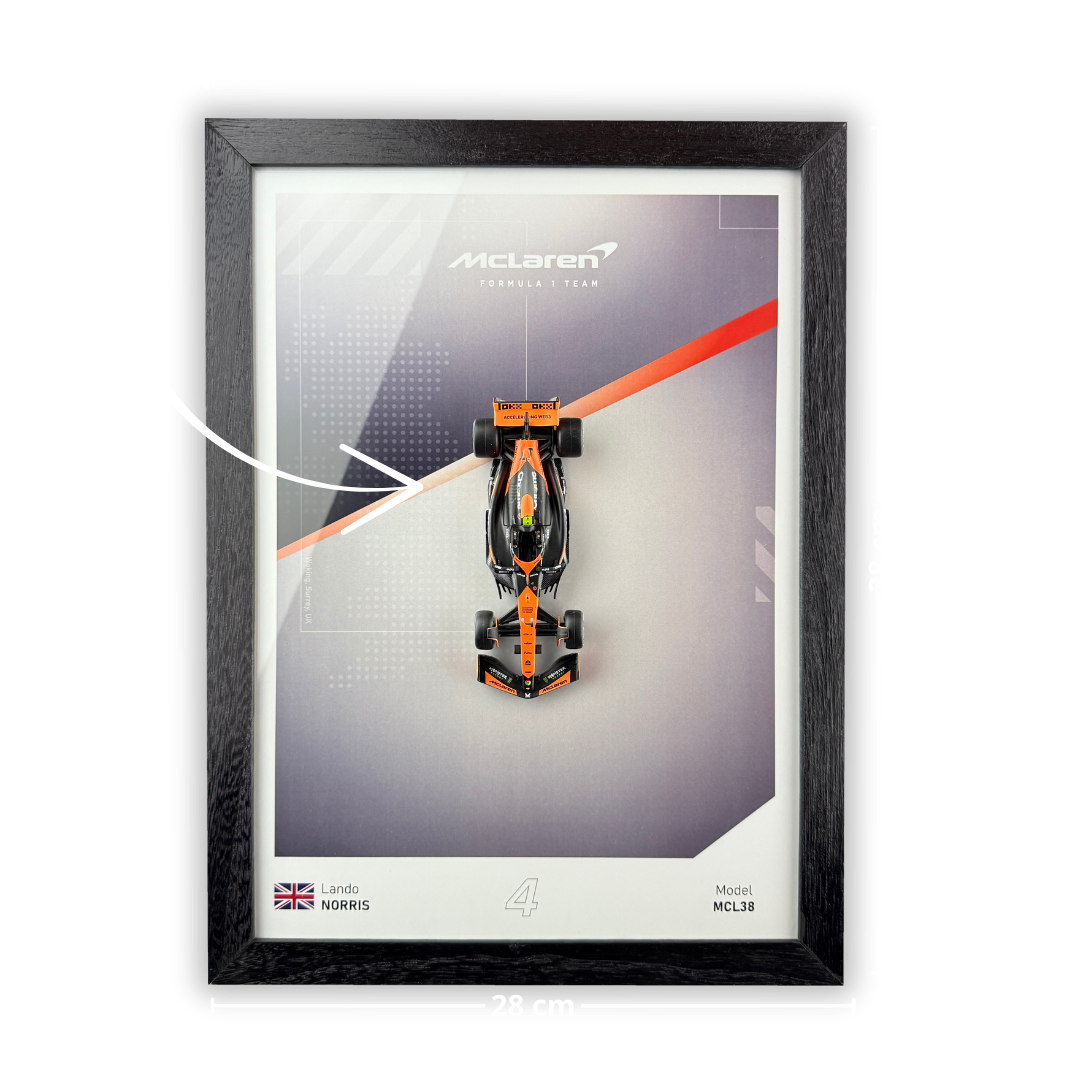 Reviví la pasión de la Fórmula 1 con este increíble cuadro coleccionable de Lando Norris y su McLaren MCL38. Diseñado para verdaderos fanáticos del automovilismo, este exclusivo cuadro con un modelo a escala 1:43 integrado, captura la esencia de la velocidad y la emoción del equipo naranja.